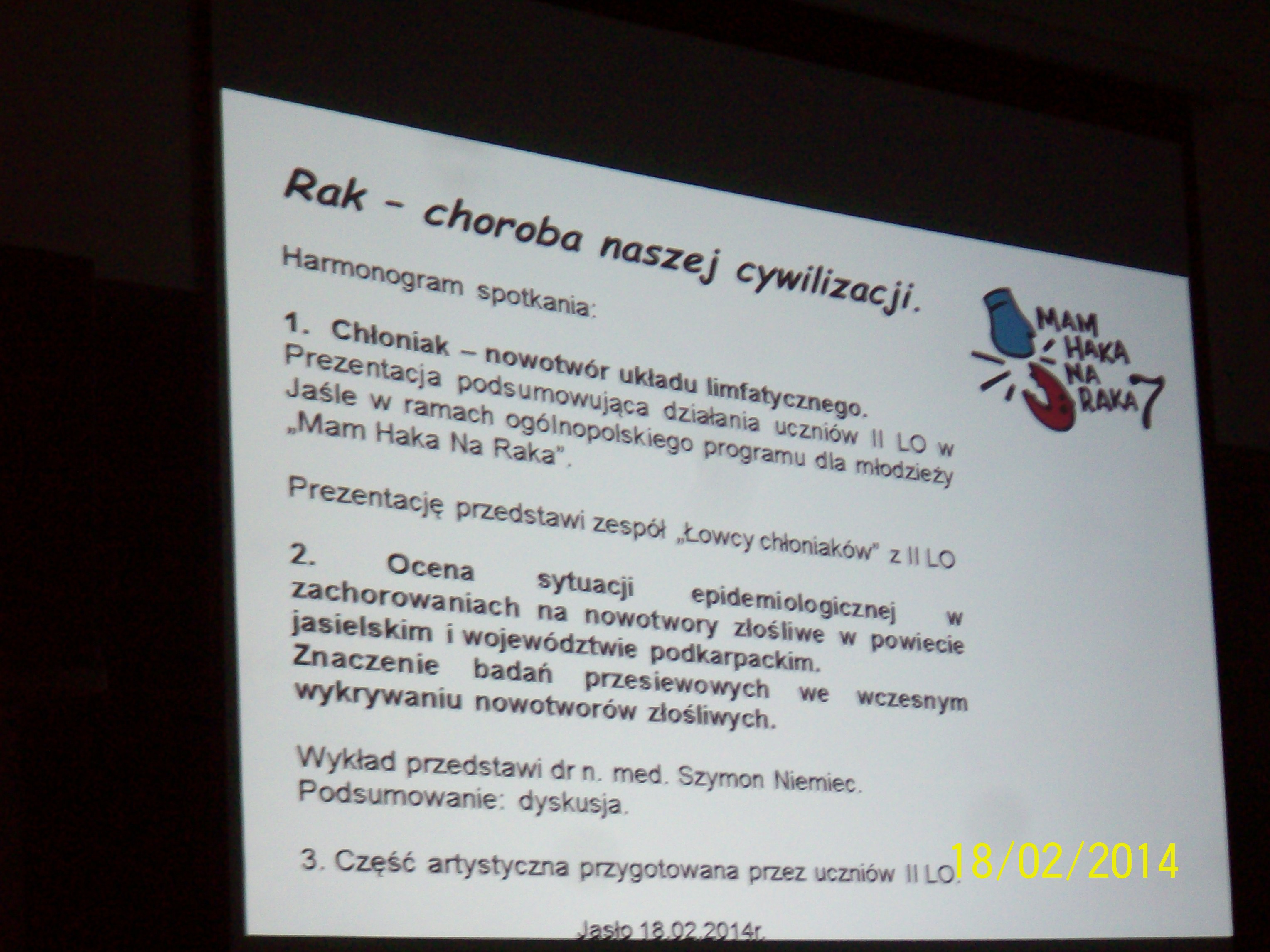 „Mam haka na raka” jest ogólnopolską akcją, której celem jest propagowanie zachowań prozdrowotnych, oswajanie młodzieży z tematyką raka, edukacja w tym zakresie, zaangażowanie młodych ludzi w kształtowanie świadomości społecznej.