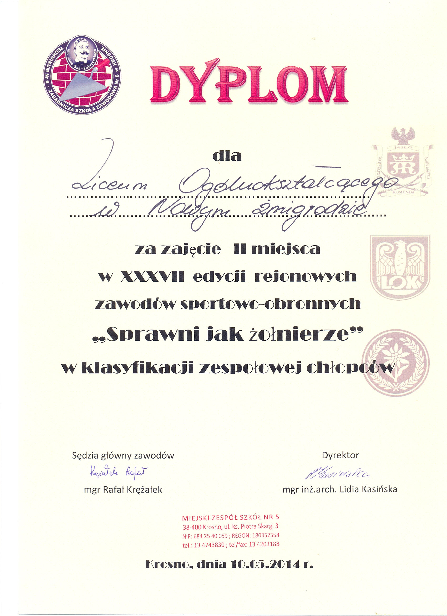 W klasyfikacji drużynowej chłopców drużyna z LO osiągnęła wspaniały sukces zajmując II miejsce XXXVII edycji zawodów sportowo – obronnych „Sprawni jak żołnierze”.